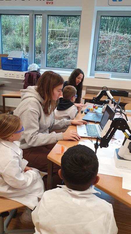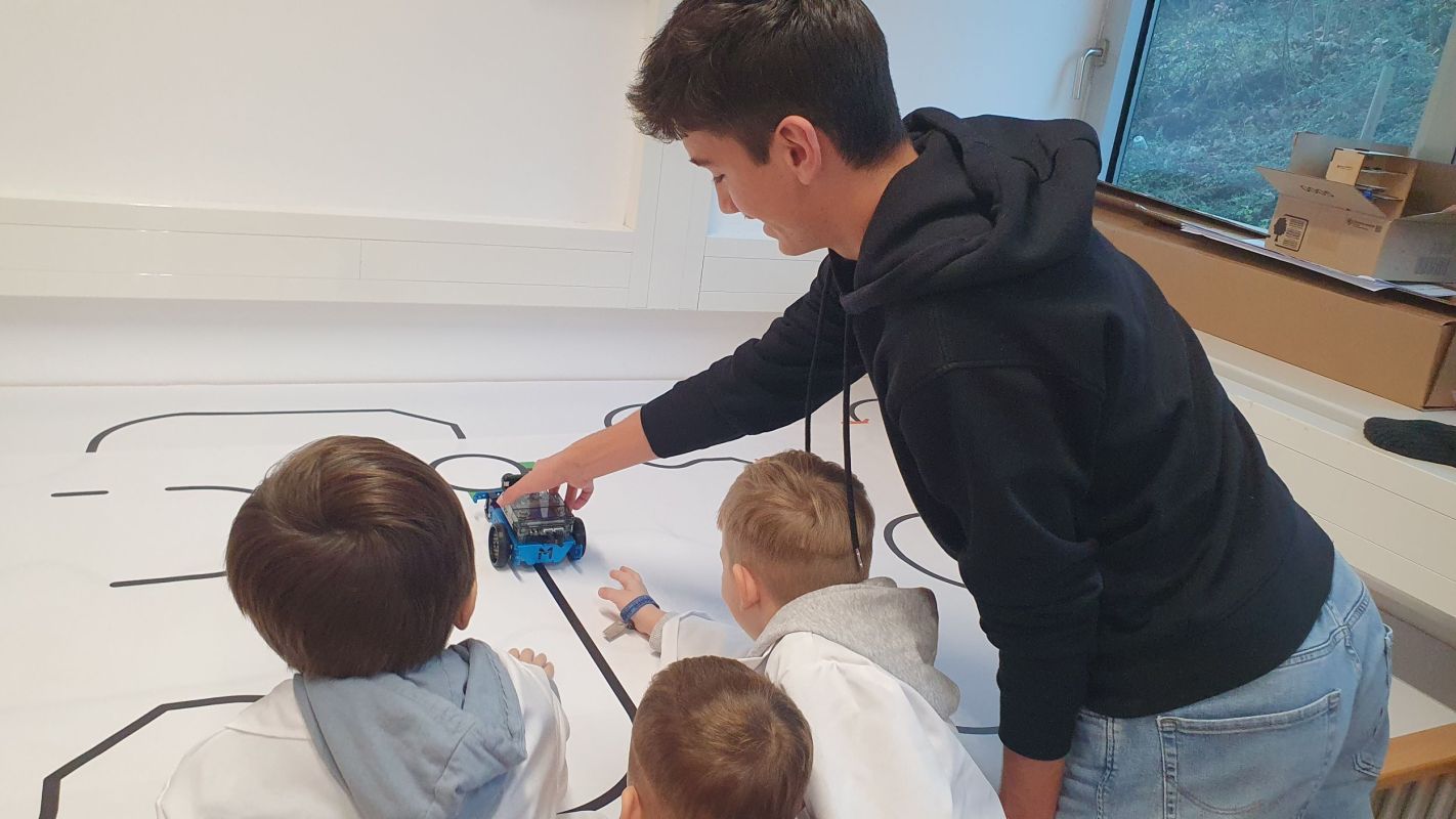 Danach ging es in das SmartERLab, wo ein Roboter eine Weihnachtskarte zeichnete, die von den Kindern ausgemalt wurde. Zusätzlich konnte dem selbstfahrenden mBot zugesehen werden, der einer Linie folgen musste. Hier freute es die Schüler:innen der 3. Klasse Robotik und Smart Engineering, dass sie den Kindern ihr Handwerk zeigen konnten.
