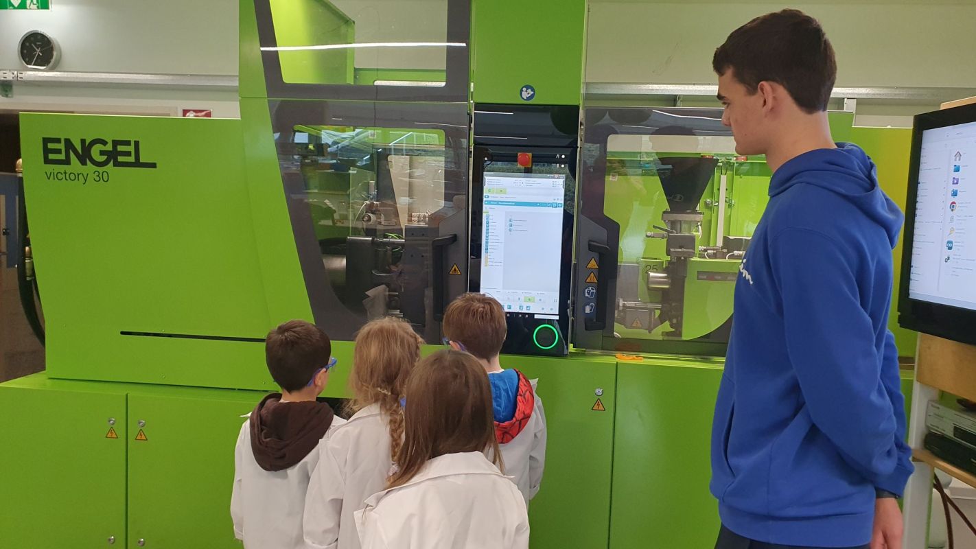 In 3 Gruppen erkundeten die Vorschulkinder die Kunststoffwerkstätte, wo ein Weihnachtsbaum mit der Spritzgussmaschine gegossen wurde und jedes Kind einen Weihnachtsbaum in Zusammenarbeit mit unseren Schüler:innen der 3. Klasse Kunststoff- und Recyclingtechnik gebaut hat. Dazu war es notwendig, die beiden Teile des Christbaumes zusammenzufügen und mit einer Bohrmaschine ein Loch für den Faden zu schaffen. Natürlich ist es notwendig, für die Arbeit in der Werkstätte einen Forschermantel und eine Schutzbrille zu tragen!